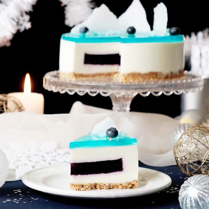 3. ボウルに《ブルーベリーゼリー》の材料を入れて混ぜたら、12cmのケーキ型に流す。凍るまで冷凍庫で冷やす。⠀