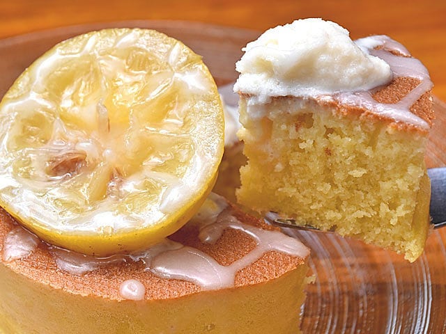 しっかりと素材の味が楽しめる、高さ4㎝、直径10㎝の『雪ノ下銀座』のパンケーキ。上に乗るレモンのコンポートはしっかりと苦みが抜かれ、皮ごと頬張れば、レモンの爽やかな酸味が楽しめる。