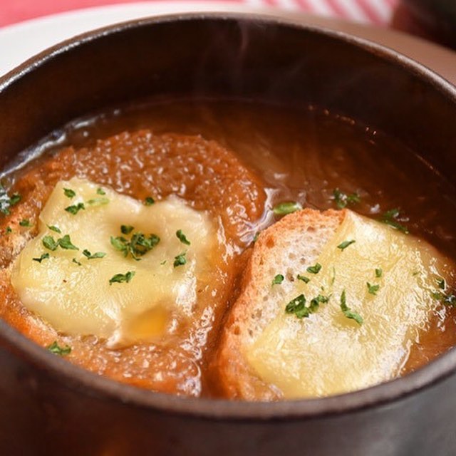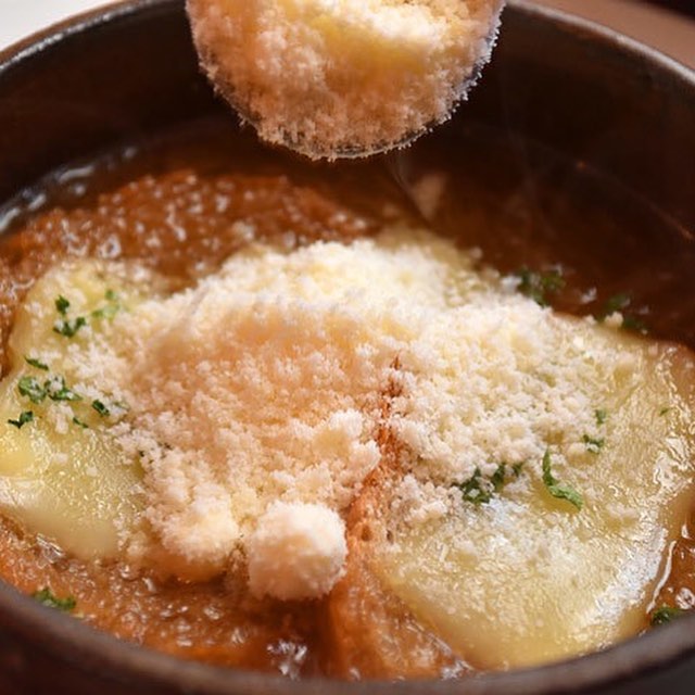 『コルシカ』の「オニオングラタンスープ」。1時間以上じっくりと炒めた玉ねぎと、3日間かけて作り上げるコンソメを合わせたスープはコク深く、じんわりと体を温めてくれる。パルメザンチーズをかけて味わうのもおすすめ! #東京カレンダー #東カレ #tokyocalendar #恵比寿 #コルシカ #ニオングラタンスープ