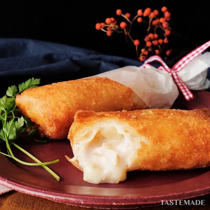 4. 春巻きの中央に3をのせて巻く。溶かしたバターを表面にぬり、もう一度春巻きの皮で巻く。巻き終わりは水溶き片栗粉を塗ってとめる。⠀