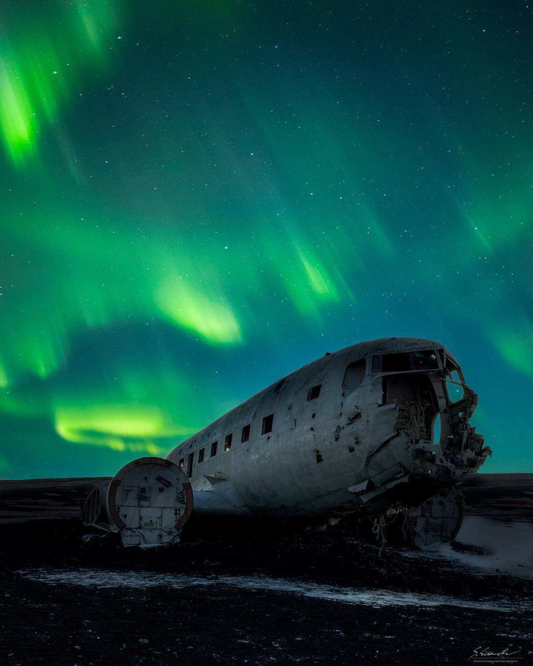 Amazing Aurora over the famous DC plane in southern Iceland!