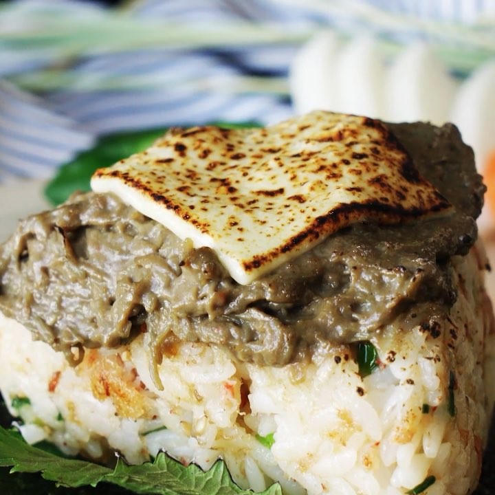 4. 海苔と大葉の上に蟹おにぎりを乗せ、蟹みそを塗り、さらにチーズを乗せバーナーで炙る⠀