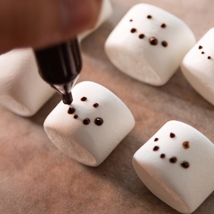 6)ペンチョコを湯煎に入れて柔らかくし、残りのマシュマロにスノーマンの顔を描き、5にのせれば出来上がりです。