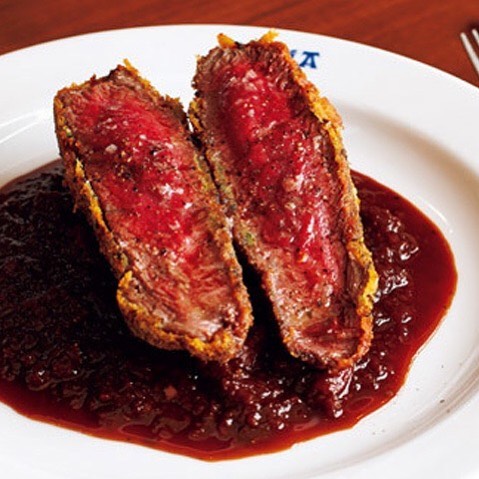 『イバイア』の「牛のヒレカツ」は、超厚切りの牛ヒレを絶妙な火入れでレアに仕上げた、珠玉の1品!美しいルビー色の肉と、カリッと揚げられた衣の色彩の美しさが食欲にスイッチを入れる。