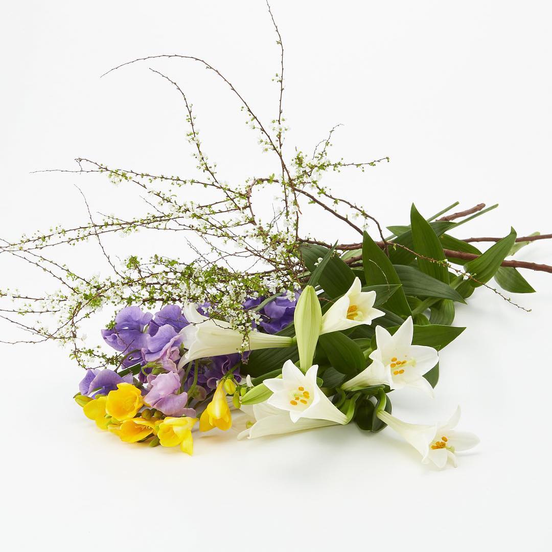 沖永良部で育てられたプチホルンという小さなテッポウユリや、茨城県産のフリージア、栃木県産のスイートピーなど香りを楽しめる初春の花をセットにしました。市場に入荷した翌日に、ご自宅にお届けします。