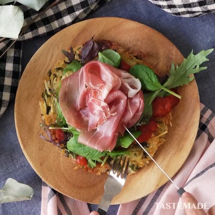 4. 皿にのせ、トマトソース、ベビーリーフ、生ハムをのせる。食べやすい大きさに切っていただく。⠀⠀