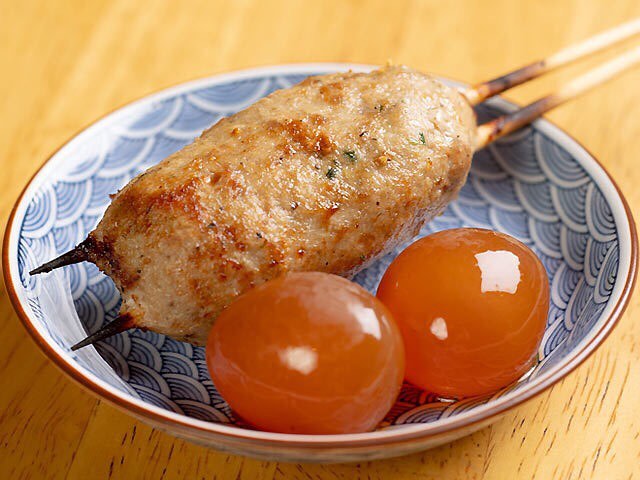 『蘭奢待(らんじゃたい)』の「つくねとキンカン」。高坂鶏を使用した生つくねに、独自の味付けを施し、キンカンをのせて海苔で包んで味わう一品。口の中でキンカンが弾け、旨みたっぷりの生つくねと混ざる瞬間の幸福感は最高!