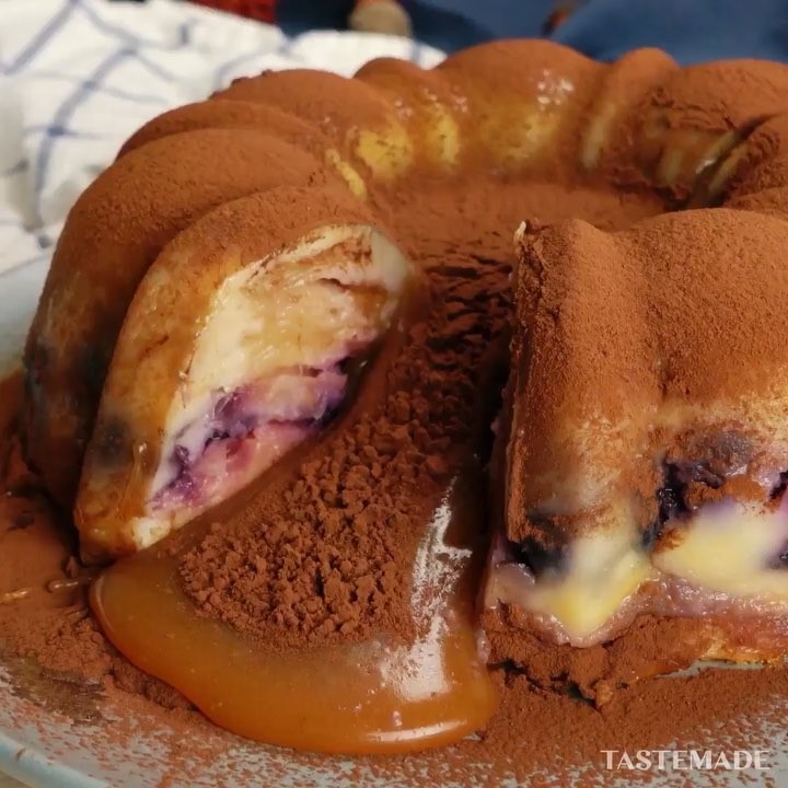 8. 型からケーキを取り出して中央の窪みににキャラメルソースを注ぎ込み、ココアパウダーをふりかけたら完成。⠀⠀
