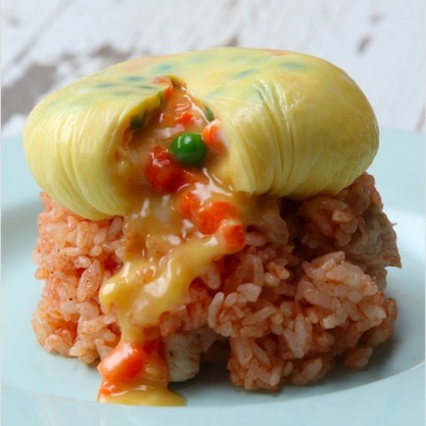 7.(2)のチキンライスをお茶碗に詰めて、平らなお皿に返し、その上に(6)のオムレツを乗せる。お好みでケチャップをかけて、完成!