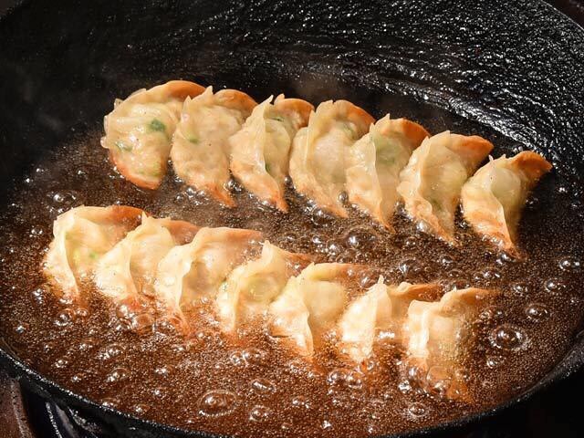 『高知名物屋台餃子 一屋』の「焼き餃子」。カリッと焼き上げられた皮の食感を生み出しているのが、焼きの工程だ。たっぷりの油で2~3分揚げる工程を経てから、よく油を切って焼き上げる。この絶妙な焼き加減により、 “カリッ”よりも、薄さのあまり“シャコッ”という表現がぴったり!