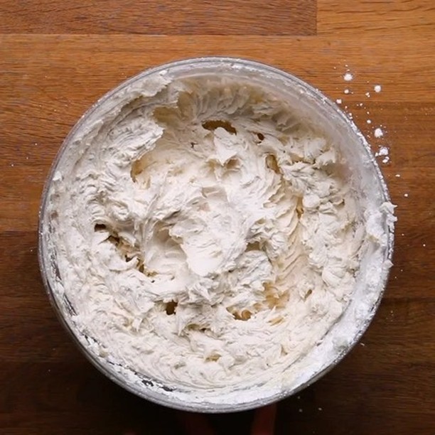 9.フィリングを作る。ボウルにバター、クリームチーズを加え、クリーム状になるまで泡立てる。