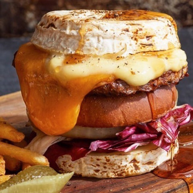 圧巻の大迫力バーガーは、「J.S. BURGERS CAFE」の期間限定メニュー「スーパーチーズバーガー」。バンズの代わりに使用されているのは、なんとカマンベールチーズ!パティとバンズ、チェダーチーズがサンドされている。