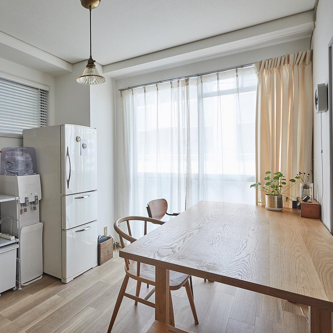 「休みの日はものづくりをして過ごすことが多いので、とにかく丈夫で大きな作業台のような物を置くのが夢でした。」大きなテーブルの前で微笑みながら縫い物をする姿が絵になる、無印良品ではたらくスタッフの住まいをご紹介します。