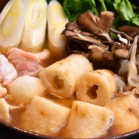 『銀座 佐藤養助 養心蔵』の「比内地鶏のきりたんぽ鍋」。秋田県産ササニシキを使用して手ごね炭火焼きで作られたきりたんぽは、長く火を通してもカタチが崩れにくく、鍋との相性抜群だ!