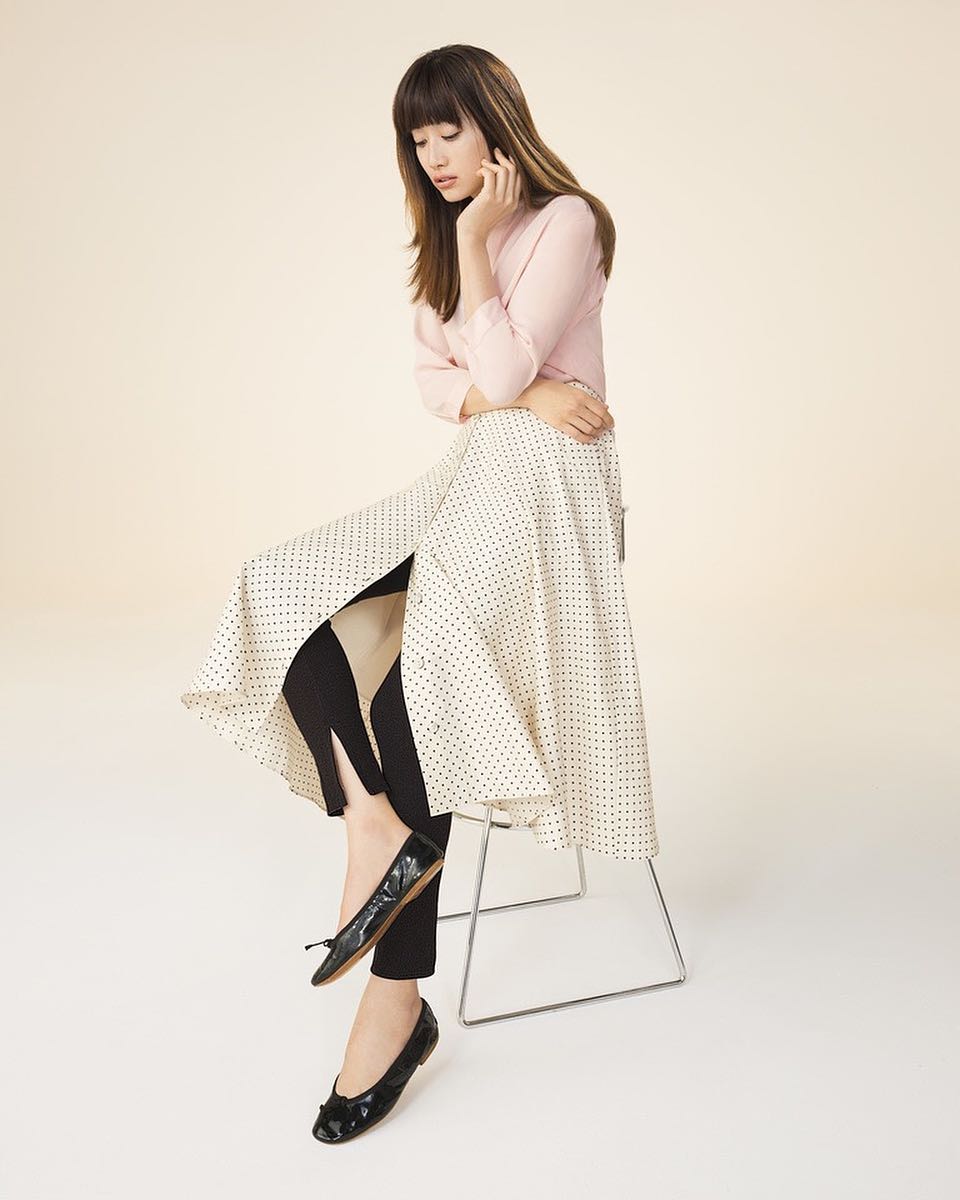 This polka-dot patterned skirt has a beautiful silhouette. Pair with this seasons’ trendy leggings. @youn1029