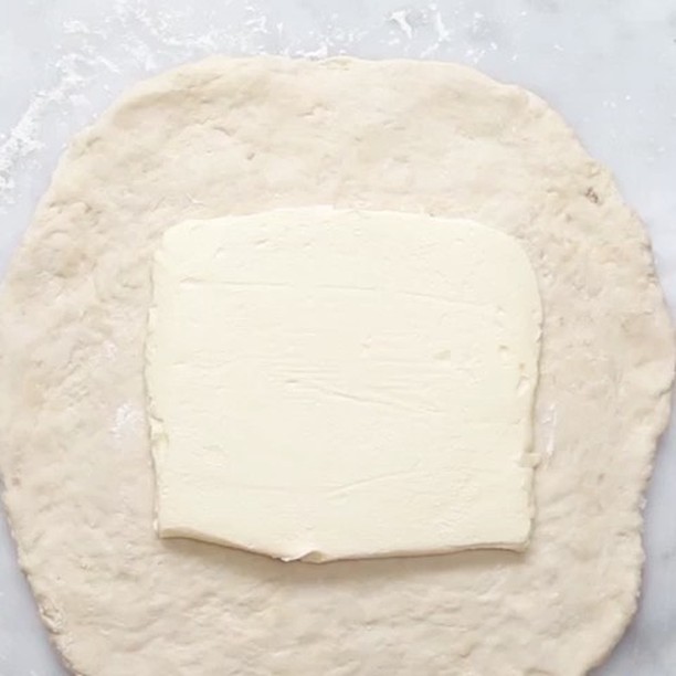 5. 中央に(3)のバターをのせて、端の生地を内側に折り込み、バターを完全に覆う。麺棒で少しずつ押しながら長方形になるように伸ばしていき、天板にのせてラップをかける。冷蔵庫に入れて1時間ほど冷やす。
