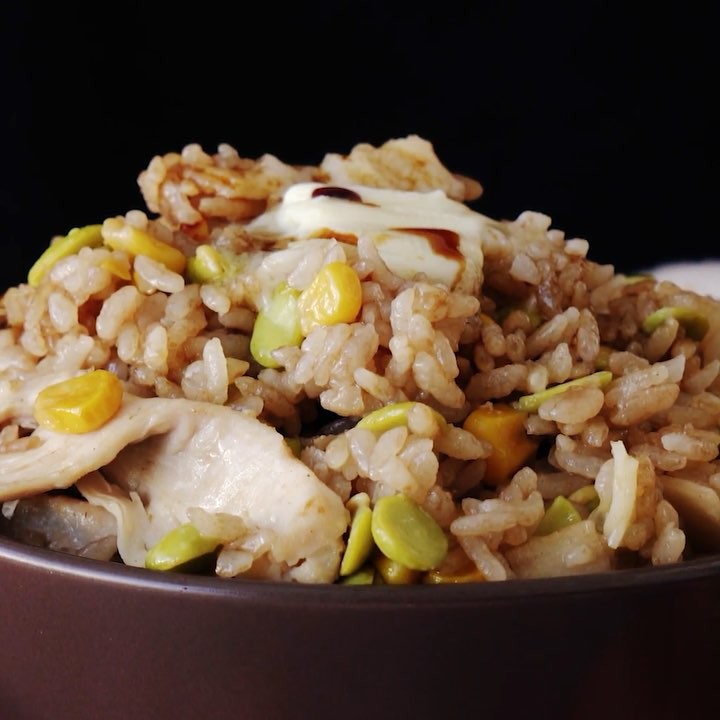 1. 炊飯器に白米と鶏もも肉と枝豆コーンさきいか、和風だしの素を振り入れ、黒ビールを注ぐ⠀