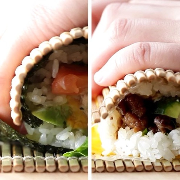6. 手前の巻き簾を持ち上げ、具材を手で押さえながら奥のご飯まで巻いて合わせる。余白の卵が下にくるように巻き終えたら、完成!
