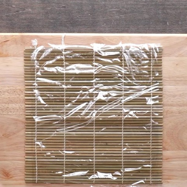 4. 巻き簾にラップを敷き、(2)をのせる。縁の3cmくらいを残して酢飯を敷き詰める。