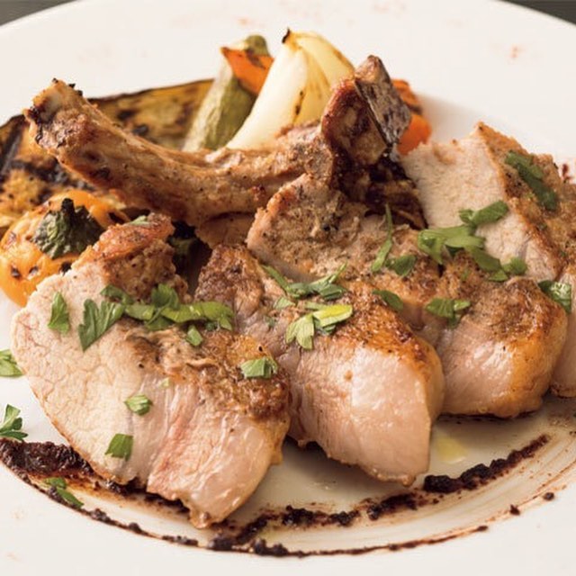 トスカーナ地方の料理を中心とした美食を堪能させてくれる『イルフューメ』。「松阪ポークLボーンステーキ」は、甘い脂が肉の旨みとともに口に広がっていく。付け合わせは三浦野菜のグリル。