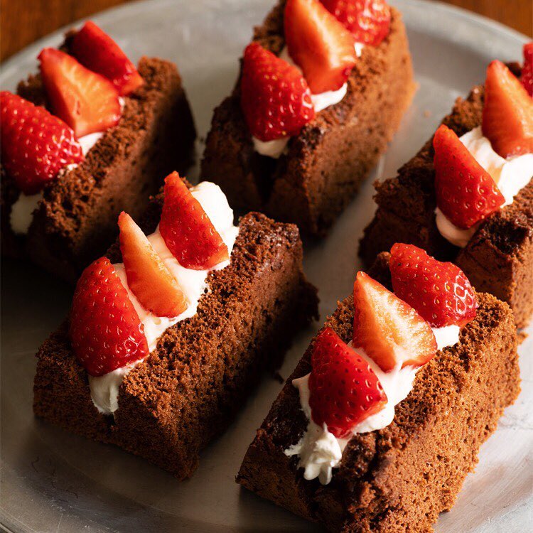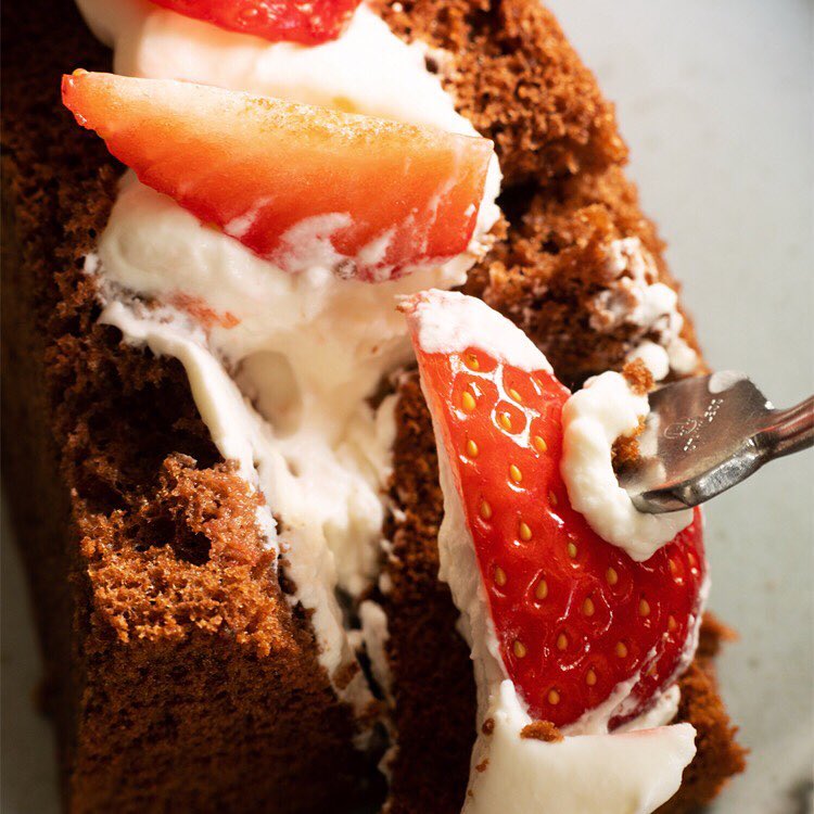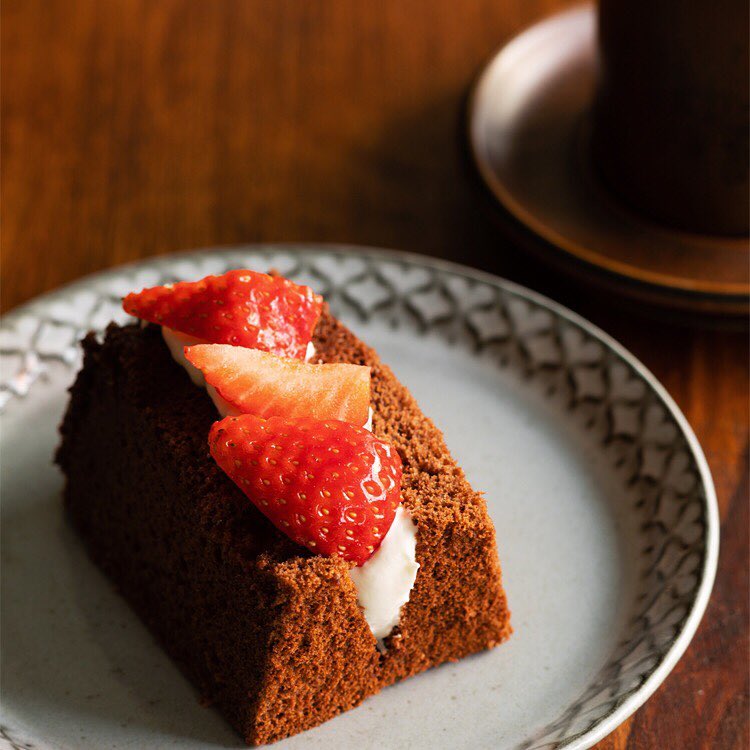 米粉でつくるチョコレートシフォンはモチモチとした食感が特徴。シフォン生地とホイップクリームの甘みに、イチゴの酸味がよく合います。
