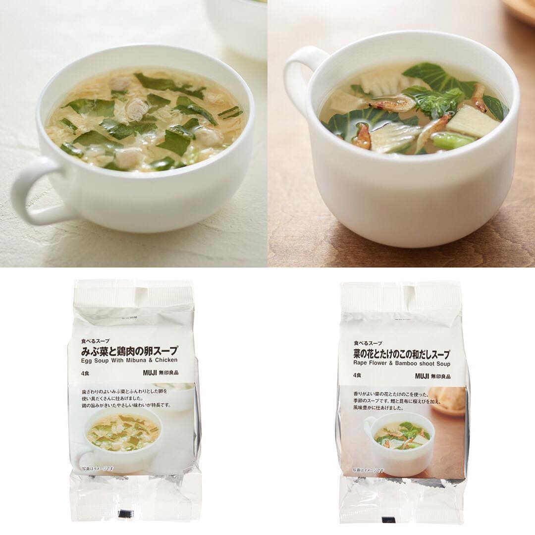 #無印良品 #MUJI #食べるスープ #soup #みぶ菜と鶏肉の卵スープ #菜の花とたけのこの和だしスープ #スープ #菜の花 #たけのこ #化学調味料不使用 #香料不使用 #合成着色料不使用 #フリーズドライ