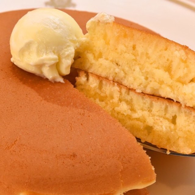 『コロンバン 原宿本店サロン』の「コロンバンのホットケーキ」。“お手本”のような美しい焼き目に、ふんわりとした生地の食感、そして甘い香り。その全てが今もなお、多くの人を魅了し続けているのだ。