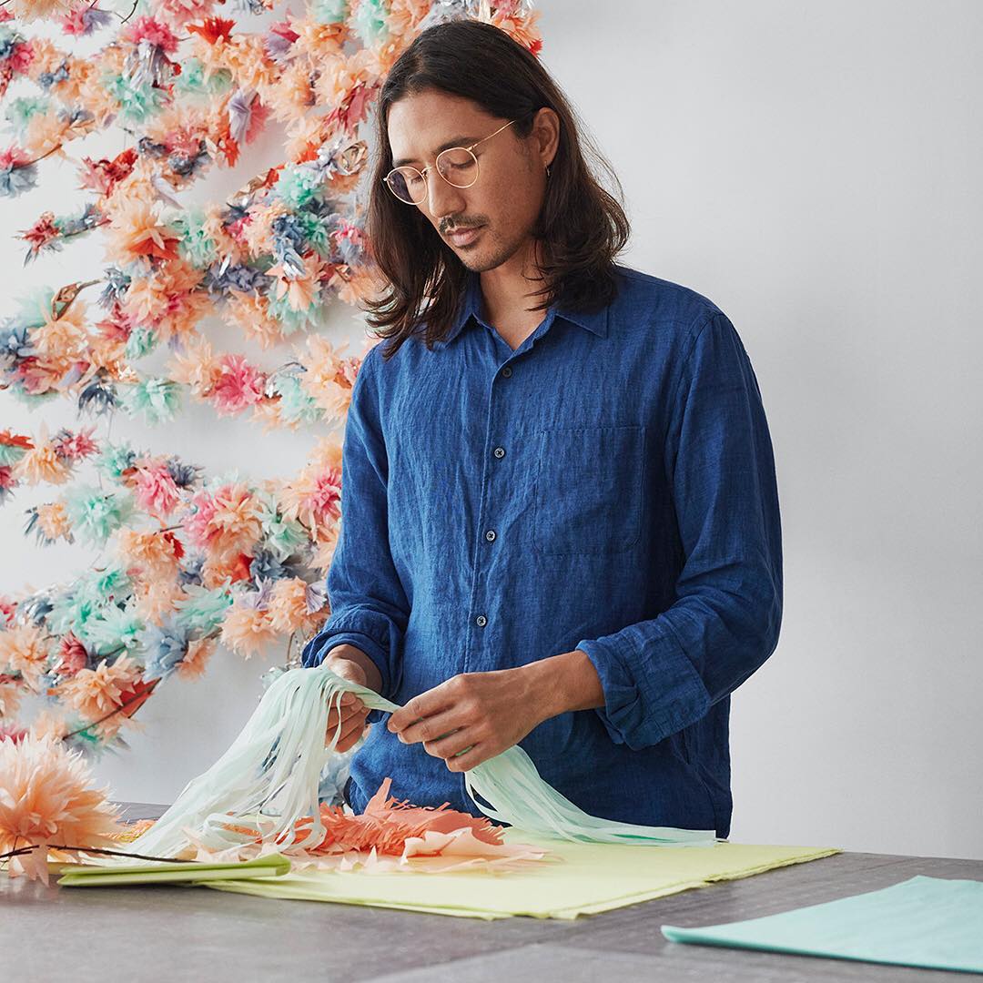 He transforms simple materials such as tissue paper, cardboard, and silk into interactive objects that create a point of focus, where memories are made and a spontaneous collaboration with the viewer is sparked.