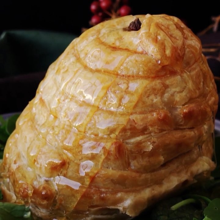 4. パイシートを貼り付け、葉っぱの形のパイも貼り付けたらオーブンで焼く(200℃15分~)⠀