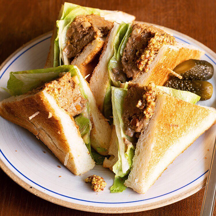 3)食パンにバターを塗ってレタス、ハンバーグ、粒マスタードの順に挟んで、ピクルスを添えれば出来上がりです。