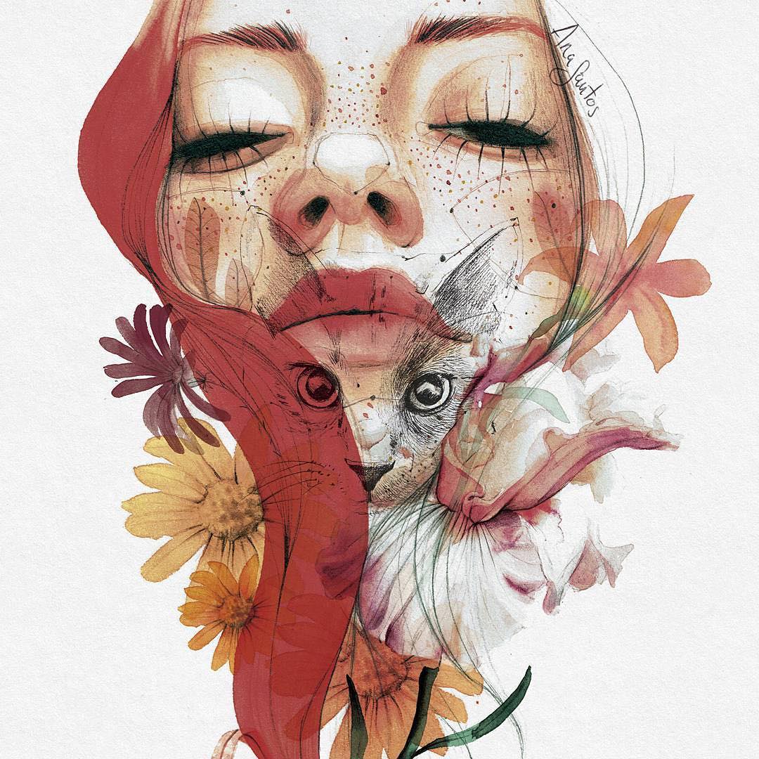 スペイン北部の街、サンタモニカのイラストレーターであり、教員でもあるAna Santos (@anasantos_illustration) さん。女性のポートレートを中心に、筆と水彩画で描いた独特な世界を表現している。「女性の表情に何かをかけあわせることで、個性を表現するのが好きです。とりわけ生き物と組み合わせることで、女性と自然が一体となる表現を描くことが多いです」ポートレイトの着想は、写真から得ることが多い。写真から受けた印象をもとに、身振りを考えて再構成する。ときには機材を使って自分で集めている写真を合成して制作に取り組むこともあるという。「探究するプロセス自体が好きです。ひとつの顔をモチーフにする場合でも、いくとおりものパターンを考えています。中には1年以上かけて完成させた作品もあります」