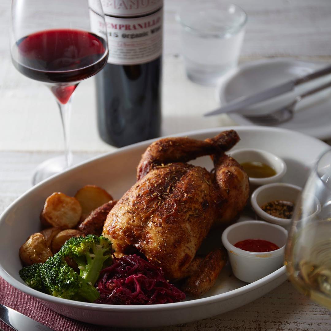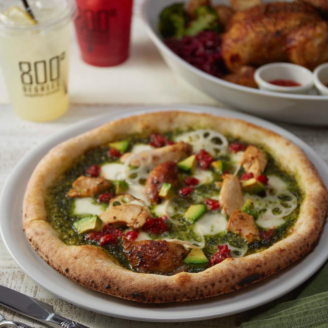 『800°DEGREES』東京国際フォーラム店限定で、レモネードに漬け込み、薪窯で香ばしく仕上げた「ロティサリーチキン」が登場。またこのチキンを使った「ロティサリーチキンとバジルのピッツァ」(税抜1,600円)は、アボカドやドライトマトが鮮やかで、インスタ映えも◎!夜の予約もスタート!