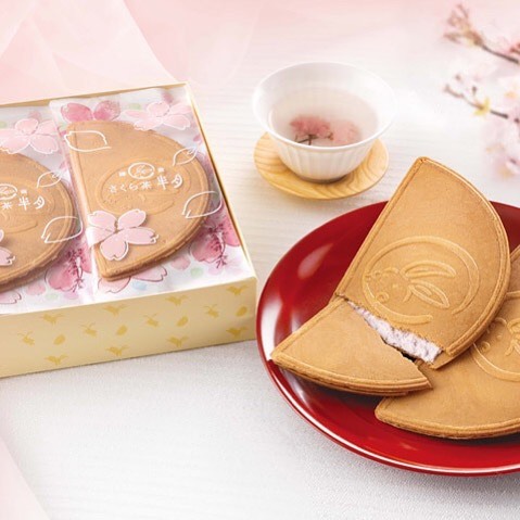 さくっと軽くて甘い半月のおせんべいが挟んでいるのは“さくら茶”のクリーム。梅酢漬けの桜の花を白湯に浮かべた風味豊かな“さくら茶”は、まさに 春爛漫の香り。