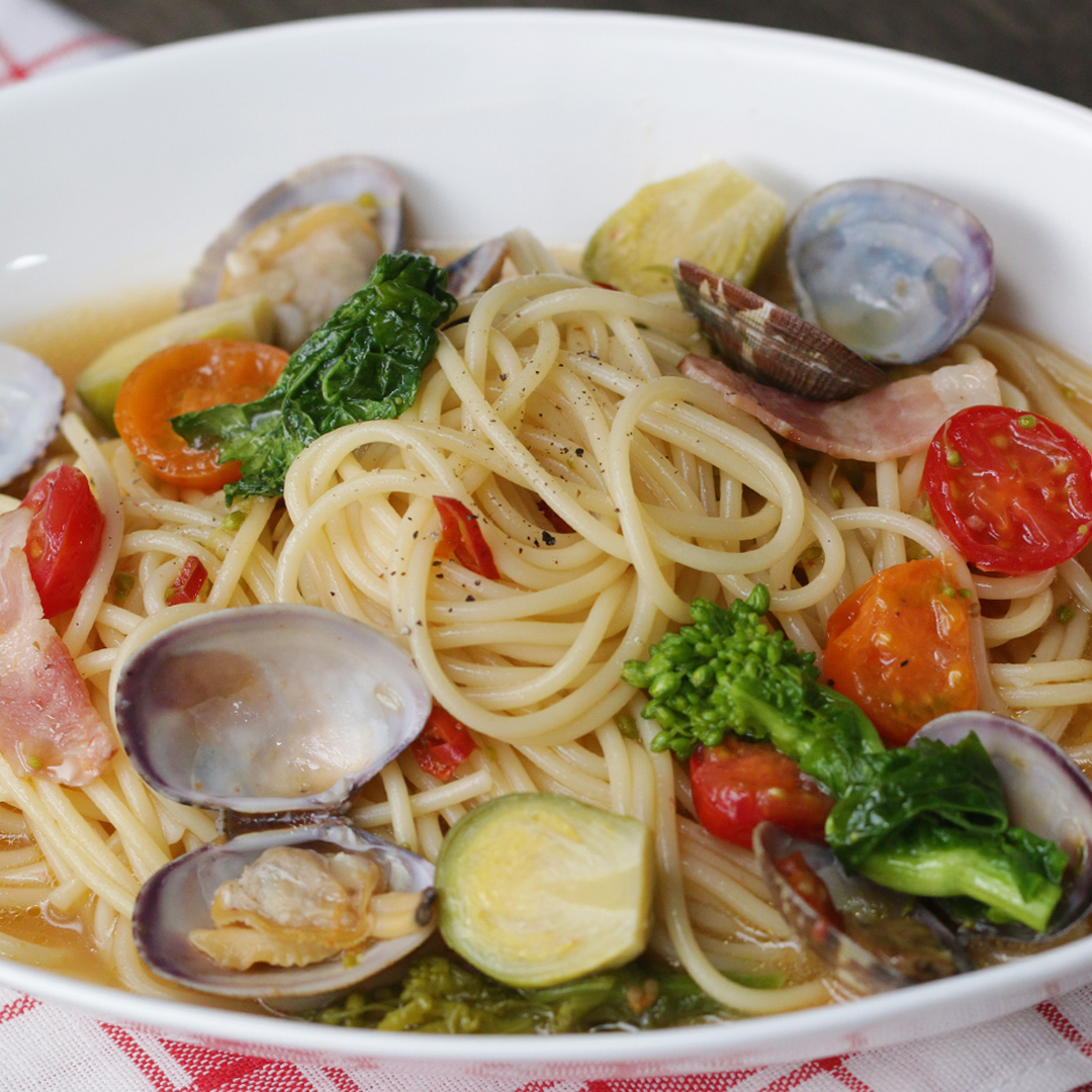 5. パスタがやわらかくなったら、蓋をあけてあさりを戻し入れる。仕上げ用のオリーブオイルを加えてひと混ぜしたら、器に盛って、完成!