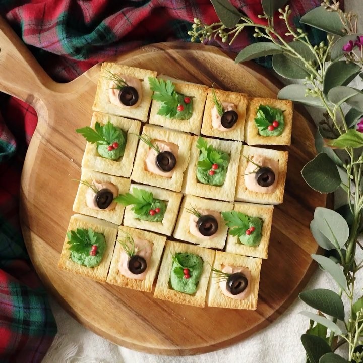 5. 焼いた食パンカップに2色のムースを絞り出し、ブラックオリーブとディル、ピンクペッパーとイタリアンパセリで飾り付けて完成⠀