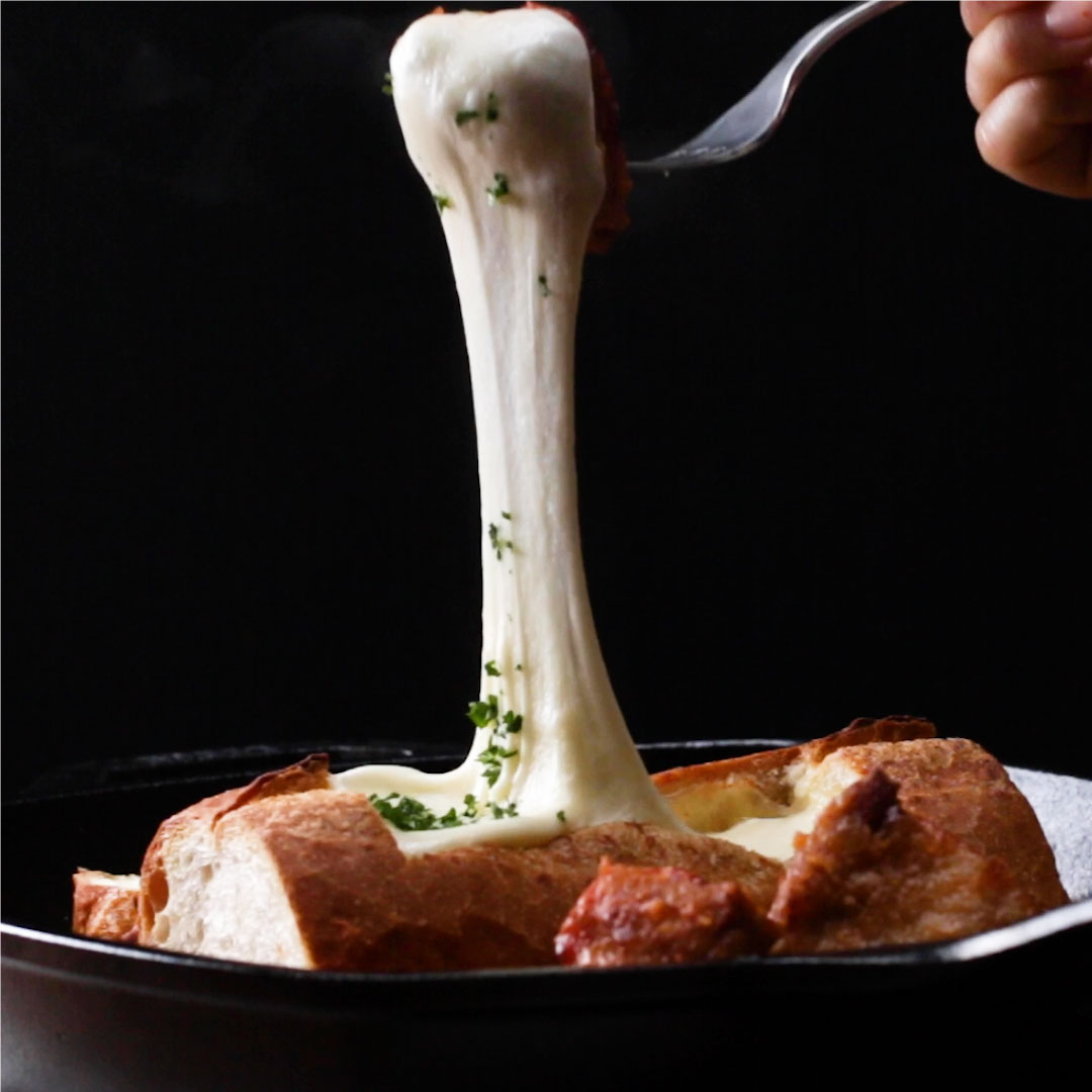 9.(5)のスキレット鍋にフライドチキンとチーズバゲットを乗せ、パセリを散らしたら、完成!