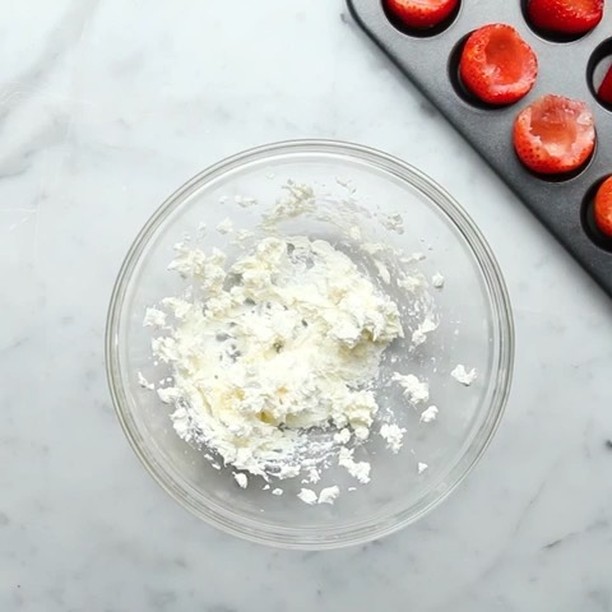 5.(4)の生地を大さじ1杯ほどすくって丸め、(3)のいちごの中に埋め込む。冷蔵庫で30分冷やし固める。