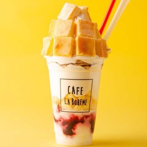 パフェもチーズケーキも一緒に食べたい!という食いしん坊の夢を叶えるボンボンパフェ。下からヨーグルトのシェイク、レアチーズケーキ、そしてレンガのように積み重ねたチーズケーキとボリュームたっぷり!