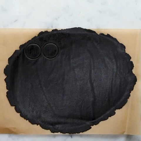 7.(5)でくり抜いた残りの生地を合わせてめん棒で伸ばし、直径4cmの丸型で24枚になるように型抜く。冷凍庫に入れて10分休ませる。