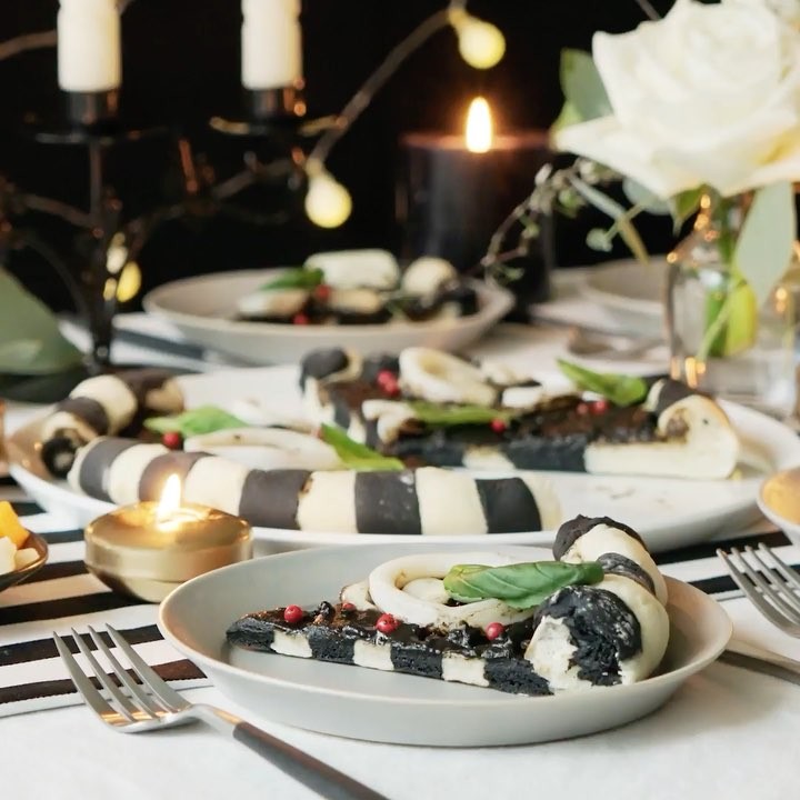 【上品ストライプ】イカスミソースのモノクロピザ #ホームベーカリー⠀