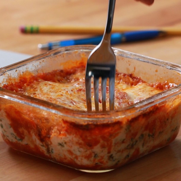 2. ガラス容器の底にマリナーラソースをしいて、ラザニアと(1)を重ねる。マリナーラソースを塗ってモッツァレラチーズをかける。これを容器いっぱいまで繰り返し、最後にたっぷりのマリナーラソースと粉チーズをかけ、蓋をしめる。
