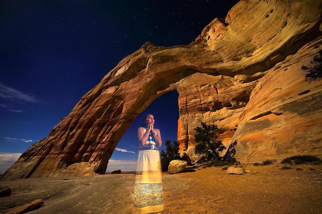 When Sara recently asked me to shoot some 8th grade graduation pictures for her, I figured it was a good time to make a lesson out of it and introduce her to a series of environmental portrait techniques. This moonlit image of Sara under White Mesa Arch created by mixing nocturnal photography with light painting.
