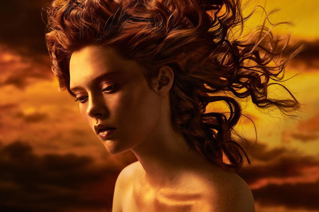 By utilizing 3 studio strobes, a printed canvas background of a sunset, and purposeful color grading, I was able to create this striking beauty photograph reminiscent of that ‘Gone with the Wind’ technique!” Camera: Canon EOS 5D Mark IV