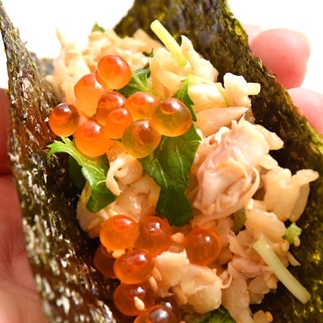 ハイライトはコース終盤で登場する「手こね寿司」。炭火で炙ったパリパリの海苔を、お客の手の上に。そこに毛蟹や鯛などのほぐし身を合わせたシャリをのせていく。自分の掌の上で完成していく楽しさが、場を一層盛り上げる。