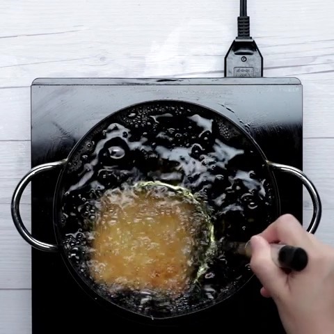 5. 180℃に熱した揚げ油に(4)を入れ、きつね色になるまで1分ほど揚げる。揚がったら、ペーパータオルなどの上に置き、油を切る。