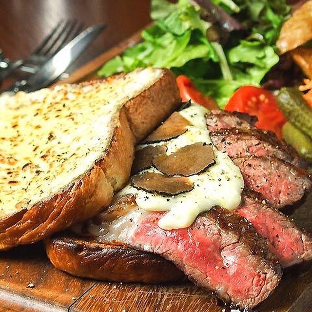 パワーランチにぴったりな、フォークとナイフで頂くボリューミーなクロックムッシュ。炒めたオニオンを敷いたパンの上には、ステーキ180g・スモークチーズ・トリュフ。 さらに、チーズたっぷりのベシャメルでグラタン仕立てにしたパンをのせすべて一緒に口に運べば、思わず笑顔になること必至だ!※1日20食限定