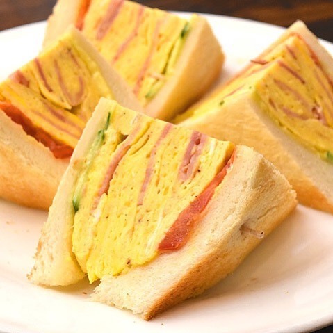 「ベーコンエッグトースト」という名前だけ聞くと、トーストの上にベーコンエッグがのっている絵を想像するが、こちらはサンドイッチだ。 中央に鎮座するのは、ベーコンを巻きながら分厚く焼き上げた卵焼き。見た瞬間「美味しそう!」と歓声が上がりそう。