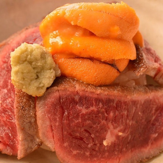 国産和牛を炭火でレアに焼き上げ、いいと特製醤油をかけ、うにをのせて完成する「TKGC」。 この牛肉にかけられるいいと特製醤油がいい仕事をしている。少し甘く、うにの味も牛肉の味も、最大限に活かされている。