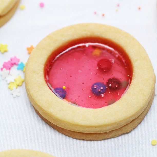 5.キャンディーが固まったら、2枚一組になるように分けておく。片方にスプリンクルを入れて、もう片方には何も入れないでおく。溶かしたホワイトチョコレートを、スプリンクルが入っていないほうのクッキーのふちにぬって、クッキー同士をくっつける。