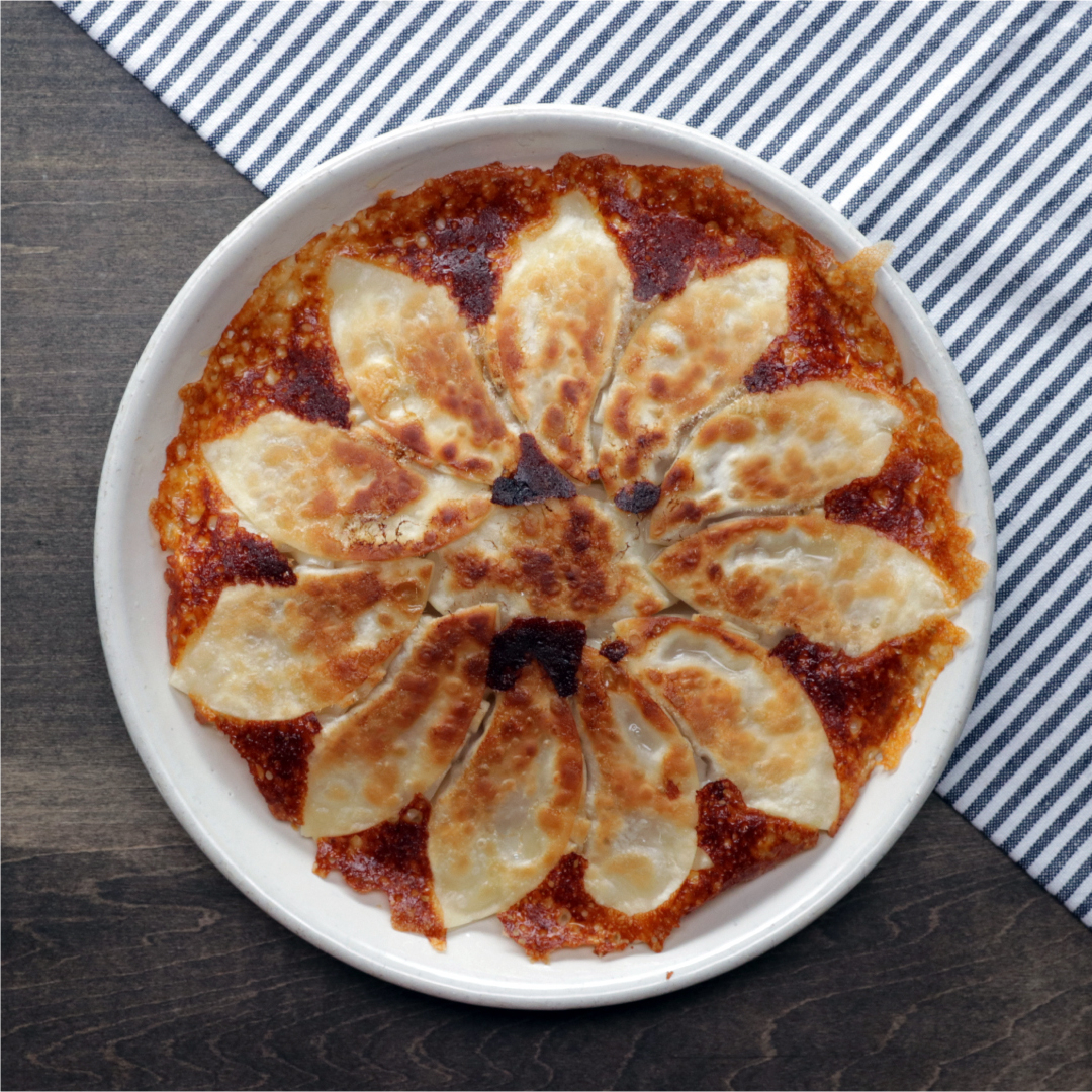 4.裏面にうっすらと焼き色がついたら、水を回し入れて蓋をして3分ほど蒸し焼きにする。